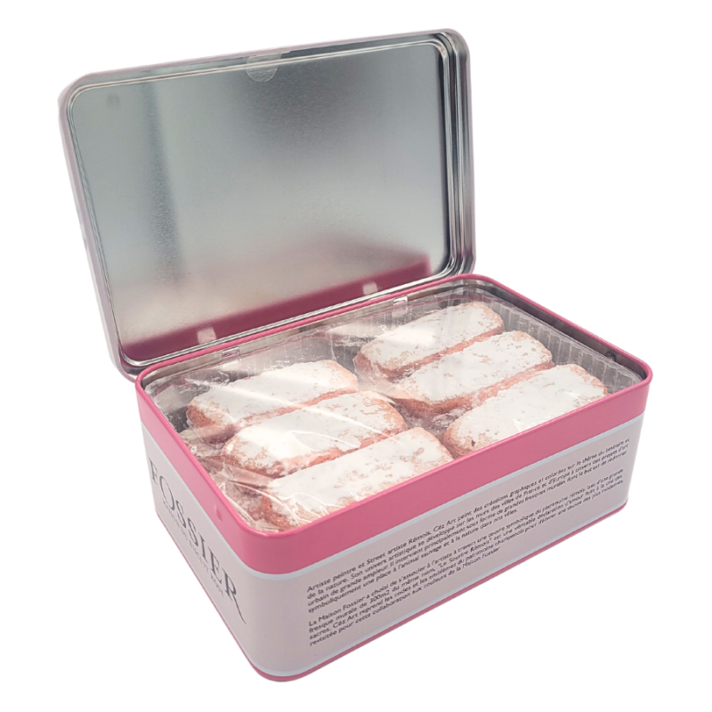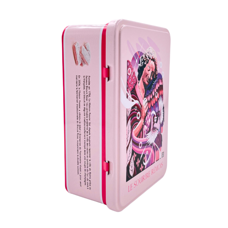 Cette boîte collector de la Maison Fossier contient 18 Biscuits Roses de Reims.