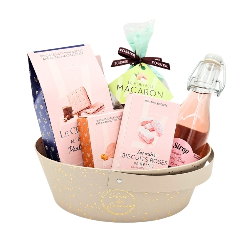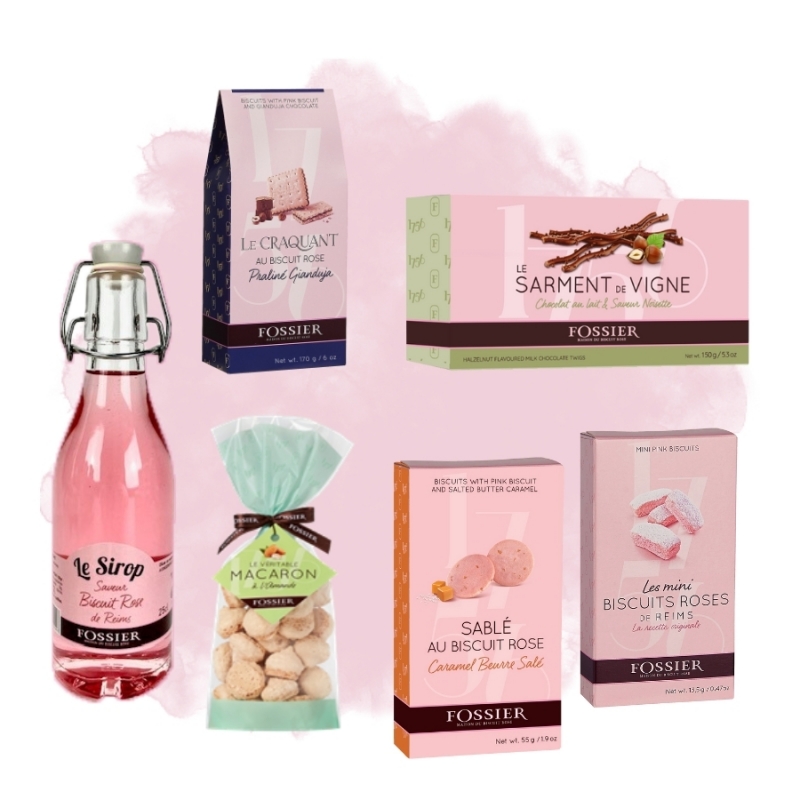 Retrouvez l'iconique Biscuit Rose en mini étui, le Craquant Biscuit Rose au Praliné Gianduja, le mini étui de Sablé Biscuit Rose au Caramel Beurre Salé, les Macarons aux Amandes, les Sarments au Chocolat Lait Noisette et le Sirop au Biscuit Rose.