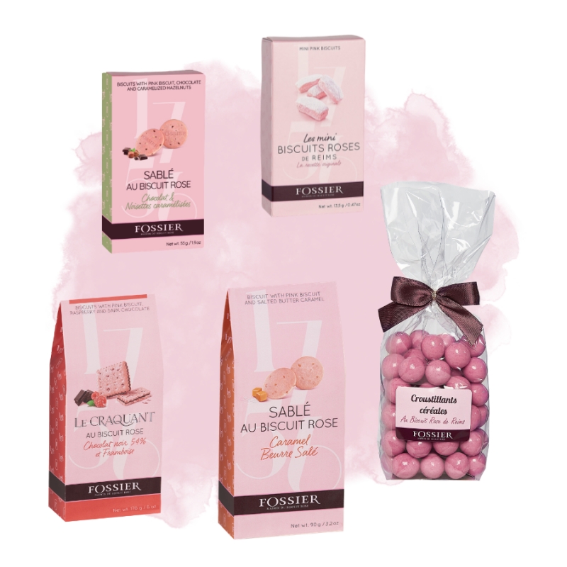 VALEURS NUTRITIONNELLES POUR 100G :MINI BISCUIT ROSE : Valeurs énergétiques (kj) : 1705 ; Valeurs énergétiques (kcal) : 403 ; Matières grasses (g) : 4,1 ; Dont acides gras saturés (g) : 1 ; Glucides (g) : 83 ; Dont sucres (g) : 55 ; Fibres alimentaires (g) : 1,1 ; Protéines (g) : 7,6 ; Sel (g) : 0,15 / SABLÉ BISCUIT ROSE CHOCOLAT NOISETTE : Valeurs énergétiques (kj) : 2067 ; Valeurs énergétiques (kcal) : 493 ; Matières grasses (g) : 21 ; Dont acides gras saturés (g) : 12 ; Glucides (g) : 66 ; Dont sucres (g) : 27 ; Fibres alimentaires (g) : 2,2 ; Protéines (g) : 8,4 ; Sel (g) : 0,46 / SABLÉ BISCUIT ROSE CARAMEL : Valeurs énergétiques (kj) : 1992 ; Valeurs énergétiques (kcal) : 474 ; Matières grasses (g) : 19 ; Dont acides gras saturés (g) : 12 ; Glucides (g) : 69 ; Dont sucres (g) : 26 ; Fibres alimentaires (g) : 1 ; Protéines (g) : 6,9 ; Sel (g) : 0,58 / CROUSTILLANT PÉTILLANT AU BISCUIT ROSE : Valeurs énergétiques (kj) : 2094 ; Valeurs énergétiques (kcal) : 501 ; Matières grasses (g) : 25 ; Dont acides gras saturés (g) : 15 ; Glucides (g) : 63 ; Dont sucres (g) : 49 ; Fibres alimentaires (g) : 0 ; Protéines (g) : 10 ; Sel (g) : 0,2 / CRAQUANT BISCUIT ROSE FRAMBOISE CHOCOLAT NOIR : Valeurs énergétiques (kj) : 1945 ; Valeurs énergétiques (kcal) : 463 ; Matières grasses (g) : 17 ; Dont acides gras saturés (g) : 11 ; Glucides (g) : 67 ; Dont sucres (g) : 27 ; Fibres alimentaires (g) : 2,4 ; Protéines (g) : 7,2 ; Sel (g) : 0,63