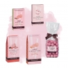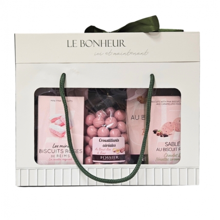 Laissez-vous séduire par notre élégant sac "Le Bonheur ici et maintenant", généreusement garni de douceurs en rose : Biscuit Rose, Croustillants, Sablés... !